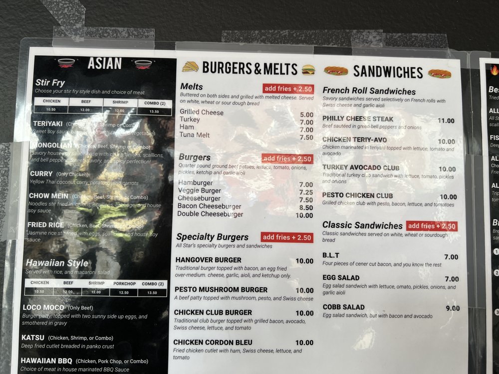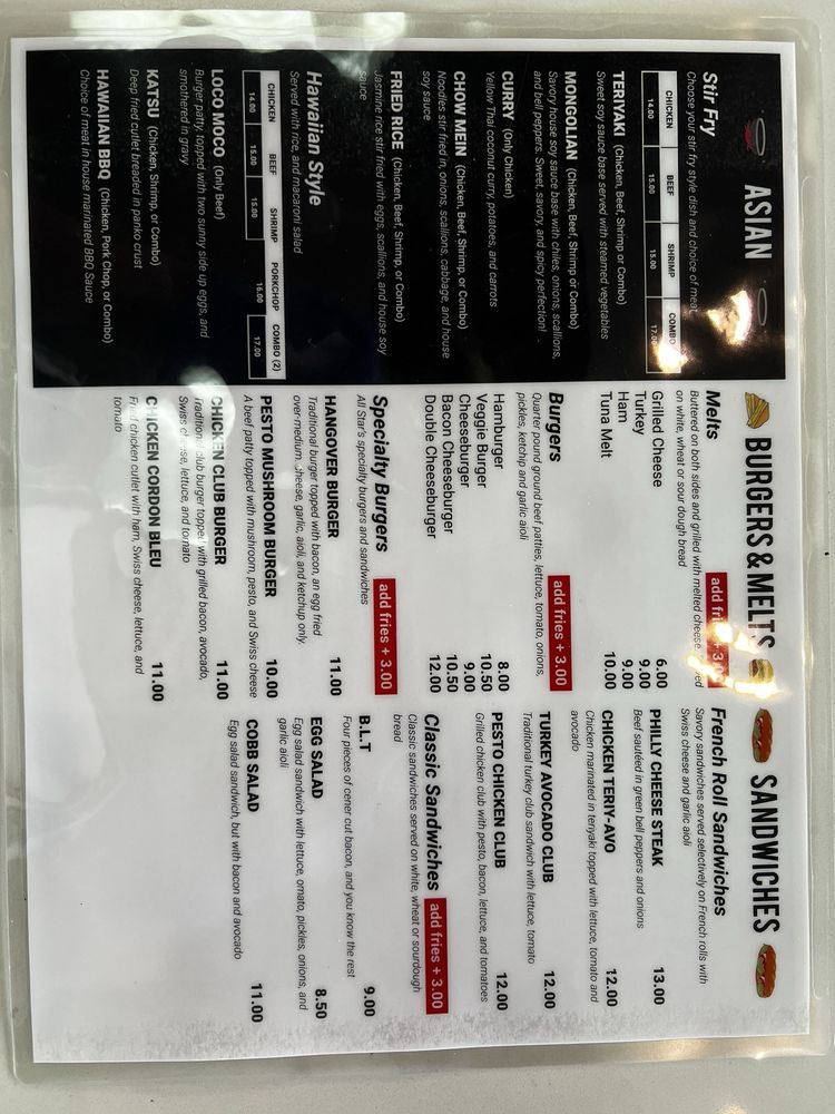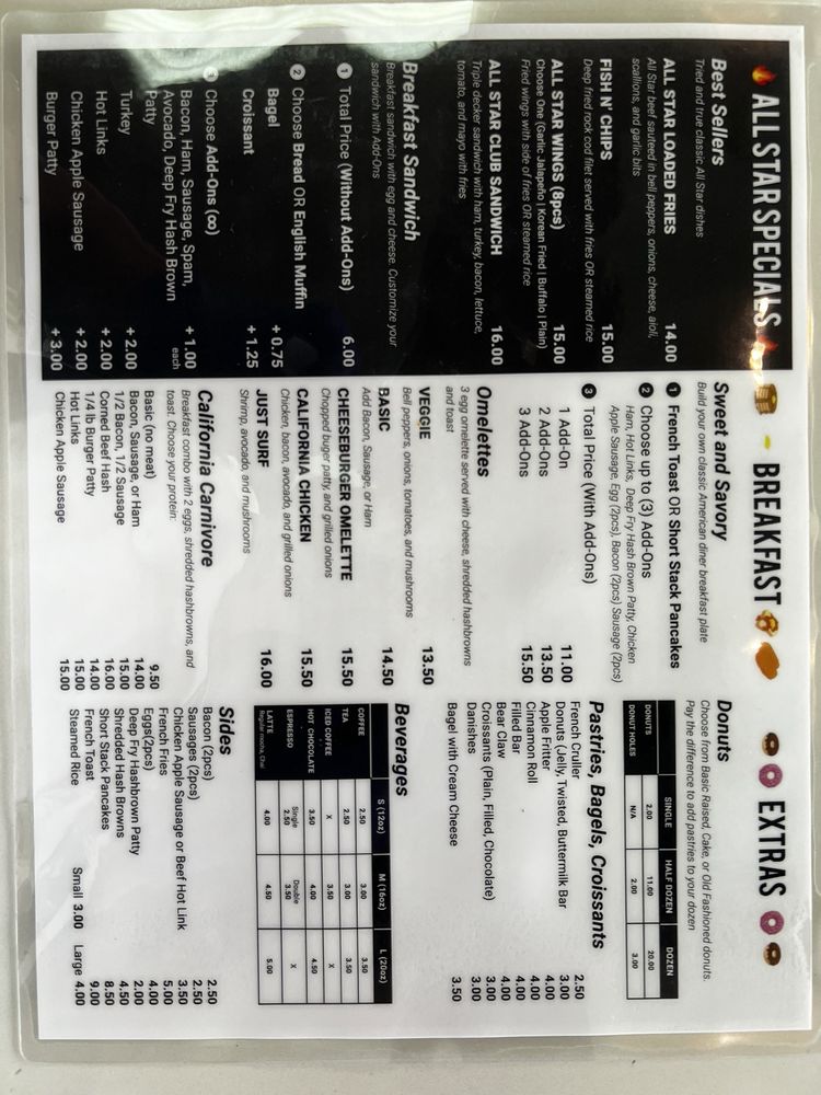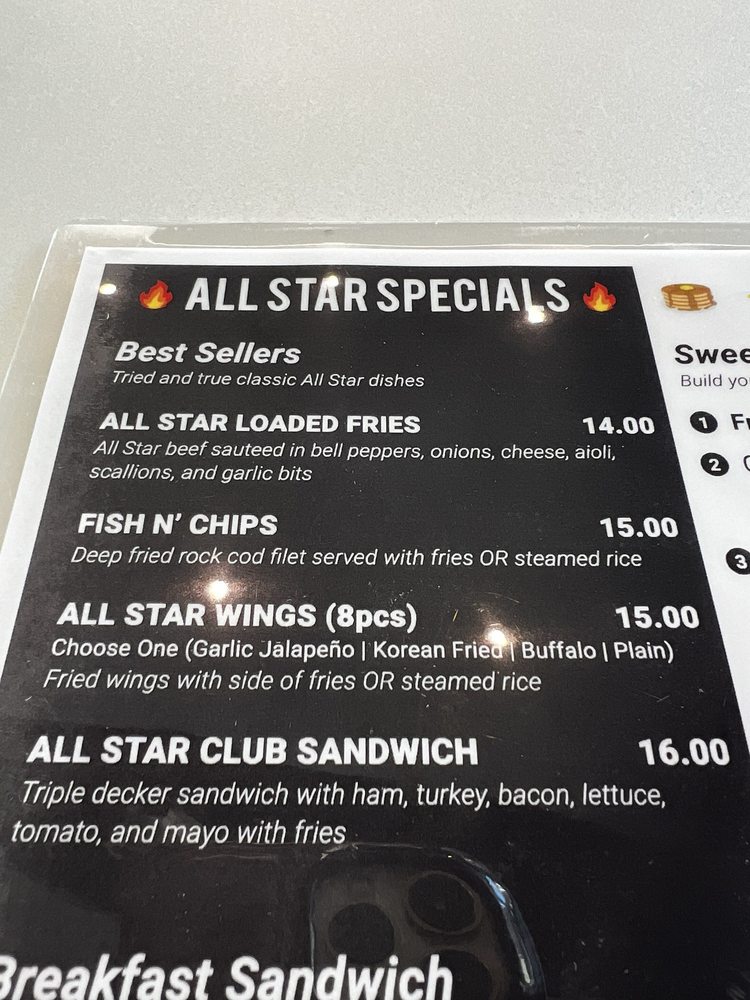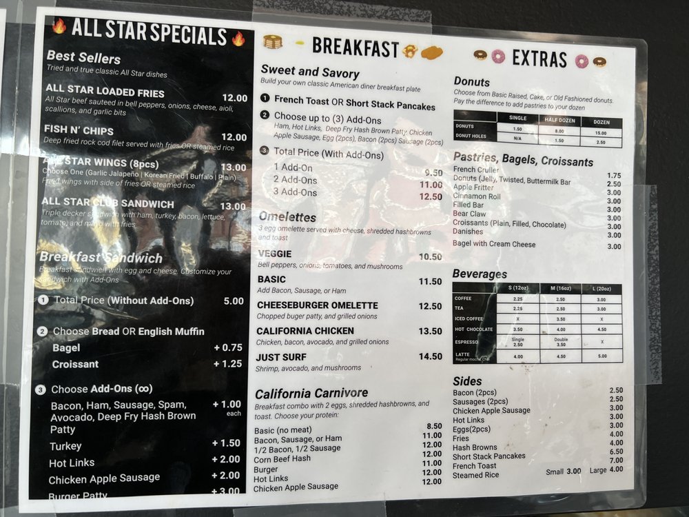 All Star Cafe in San Francisco is a breakfast and brunch spot that offers a variety of delicious dishes. With options like the All Star Specials including Golden Fried Garlic Fish and All Star Loaded Specialty Fries, there is something for everyone to enjoy. The menu also features customizable breakfast sandwiches and hearty breakfast plates like The Californian Carnivore and The Hash House. Customers rave about the home-style food and friendly service, making this spot a hidden gem in downtown San Francisco. The cozy atmosphere and affordable prices make it a must-visit for those looking for a satisfying meal. Don't miss out on their refreshing beverages like Coffee, Tea, and Chai Tea Latte to complete your dining experience at All Star Cafe.