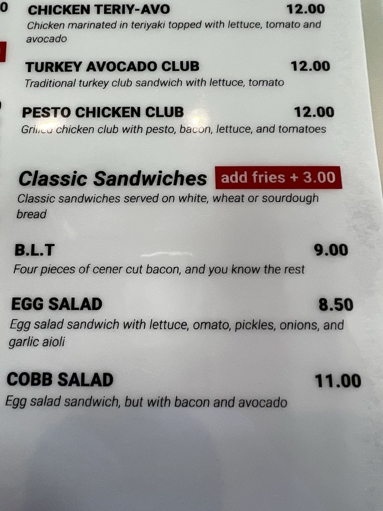 Bacon, avocado, egg salad, lettuce, tomato, and mayonnaise on choice of slice bread.